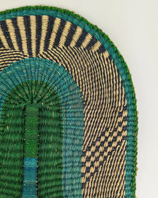 Meticulously woven by skilled artisans using time-honored techniques, this fan is more than just a functional accessory – it's a work of art. The intricate patterns and vibrant colors reflect the beauty and diversity of Ghanaian culture, making it a unique and eye-catching addition to any space.